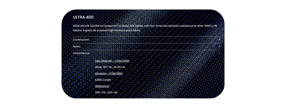 - Aer Ultra-serie: Het Ultra400X-materiaal dat in de Aer Ultra-serie wordt gebruikt, is vervaardigd uit 400D Ultra-PE-stof, een mix van zeer sterke polyestervezels, en gelamineerd met Ultra-PE CrossPly. De stof is voorzien van een 0,5 mm dikke filmlaag. De treksterkte is 15 keer die van staal, waardoor het een van de sterkste vezels is die momenteel commercieel verkrijgbaar zijn, met een extreem lage dichtheid. Dit composietversterkte materiaal is ontworpen voor hoogwaardige, lichtgewicht outdooruitrusting en biedt uitzonderlijke duurzaamheid met een minimaal gewicht.
