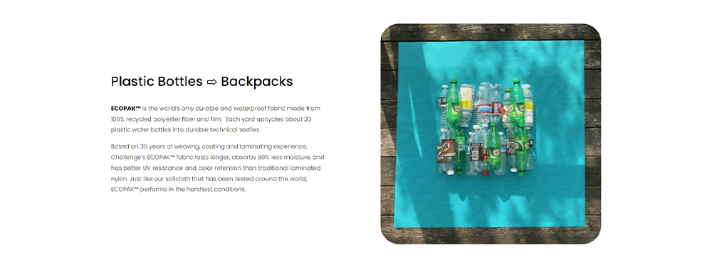 - De Tortuga reisrugzak Dit product maakt gebruik van ECOPAK™ EPX200 waterdicht materiaal, een hoogwaardig, milieuvriendelijk materiaal ontwikkeld door Challenge Sailcloth. ECOPAK™ EPX200 is 's werelds eerste composietstof gemaakt van 100% gerecyclede materialen. De structuur bestaat uit een 200D rPET buitenlaag, een 45° blauwe CrossPly verstevigingslaag, een scheurvaste 70D voering en een RUV™ gerecyclede folie achterkant. Deze gelamineerde constructie, gecombineerd met een waterbestendigheid van meer dan 200 PSI, zorgt ervoor dat het materiaal bestand is tegen zware regenval. De 45° CrossPly versteviging verbetert de diagonale sterkte aanzienlijk, vermindert snijafval en voorkomt vervorming van de stof, waardoor het een ideaal materiaal is voor optimale reisprestaties.