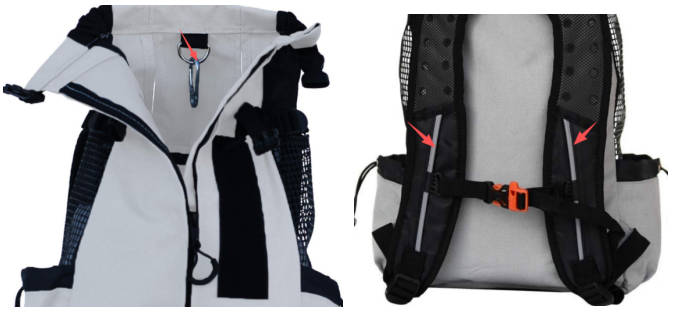 9. Veiligheidsbeschermingssysteem— De rugzak is voorzien van een veiligheidsgesp die losraken voorkomt. Deze gesp kan in combinatie met de halsband van de hond worden gebruikt om ervoor te zorgen dat de hond veilig op zijn plaats blijft tijdens een noodstop. De reflecterende strips zijn op de schouderbanden aangebracht (niet over de hele tas) om te voorkomen dat fel licht de aandacht van de bestuurder verstoort, terwijl de zichtbaarheid voor tegemoetkomend verkeer wel gewaarborgd blijft.