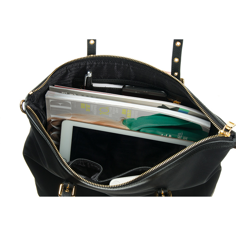 0.78 lbThe body of this tote bag features finely textured 230D twill nylon with a subtle sheen, paired with smooth black PU leather for trims and structural reinforcement. Inside, a high-end glossy black nylon jacquard lining elevates the overall finish, reinforcing its positioning among contemporary designer bags.