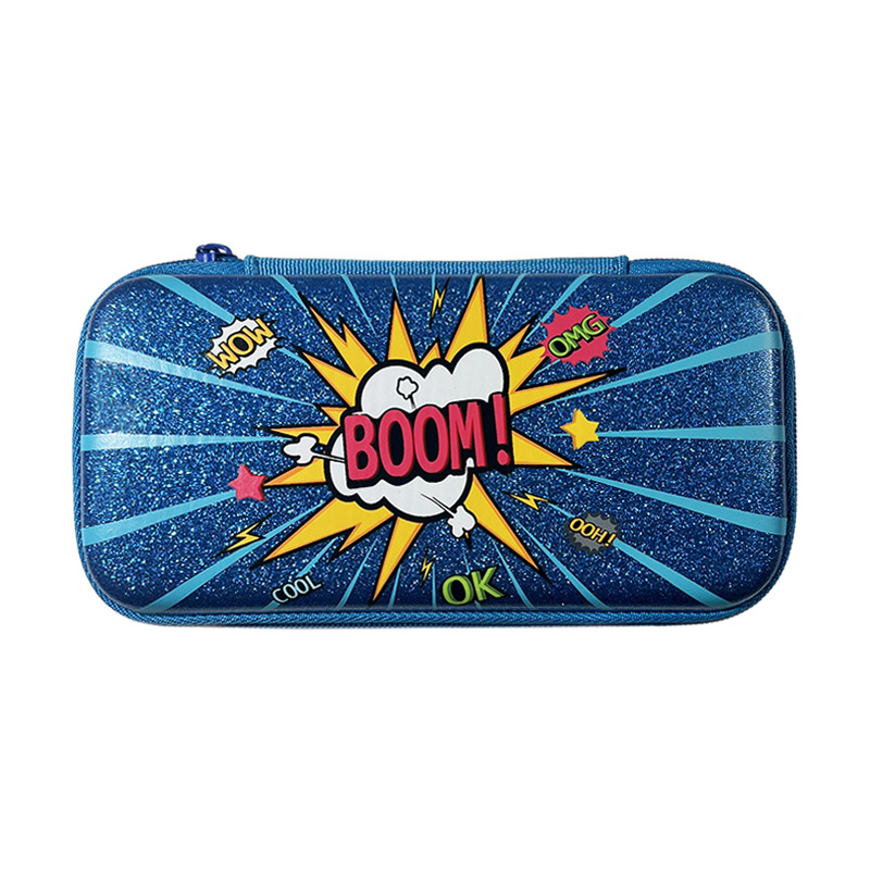 Crafted from durable EVA material, this pencil box is both sturdy and lightweight. The front is adorned with a striking "BOOM!" graphic, designed to grab kids' attention instantly. The back is made from a blue jacquard fabric, complementing the overall design. Inside, the pencil case features a mesh zippered compartment on the lid, perfect for separating smaller items such as erasers, sharpeners, or even pens. The combination of sleek design and practicality makes this a cool pencil case that’s sure to impress.
