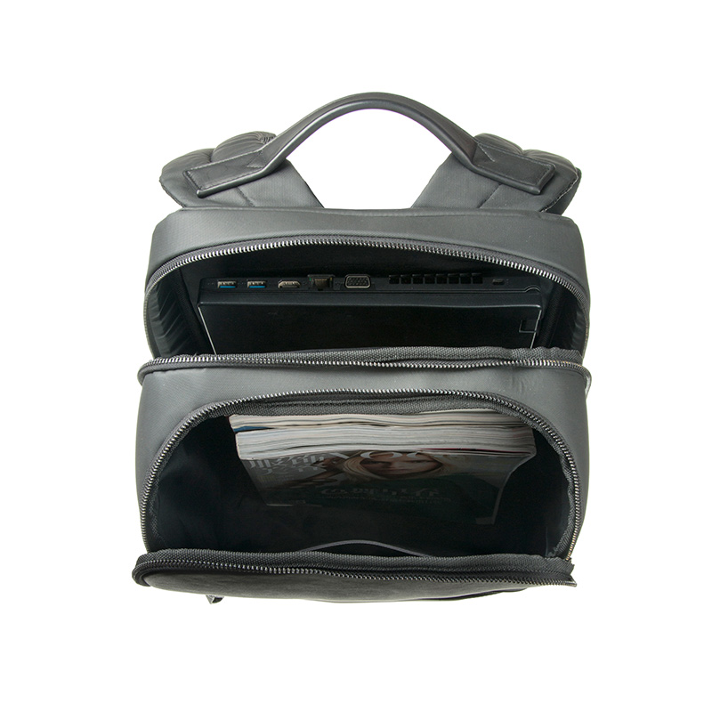 The third compartment, located closest to the back panel, is purpose-built as a protective laptop backpack section, securely holding a mobile computer or neatly folded garments. A built-in trolley sleeve allows the travel backpack to slide over a suitcase handle, and discreetly hidden inside the sleeve is an additional zippered pocket for small valuables—an unexpected yet practical detail.