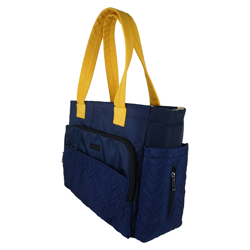Het voorvak en de twee zijvakken zijn voorzien van doorgestikte naden, wat textuur en een verfijnde uitstraling geeft. Op het voorpand bevinden zich twee ruime vakken met ritssluiting voor veelgebruikte spullen. Het rechtervak fungeert als tissuehouder en is voorzien van een verticale ritssluiting voor snelle en gemakkelijke toegang. Een vak met ritssluiting op het achterpand biedt veilige opbergruimte voor persoonlijke bezittingen.