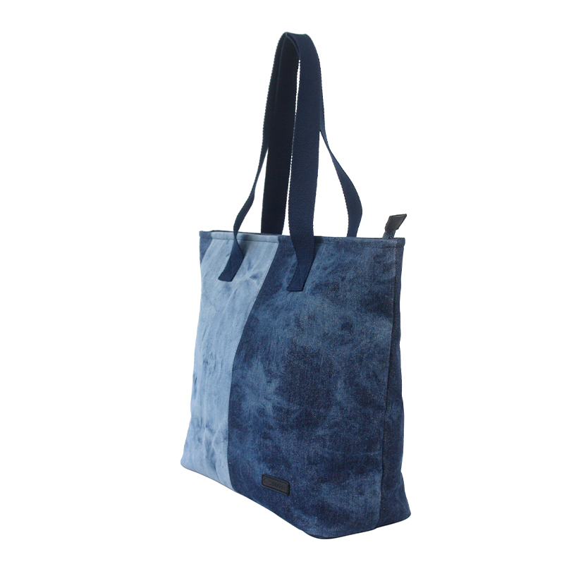 This versatile tote bag doubles as a handbag and features a bold two-tone washed denim design. Equipped with a secure silver zipper, it combines fashion and practicality, making it a standout choice among tote handbags for women and women's tote bags for work.
